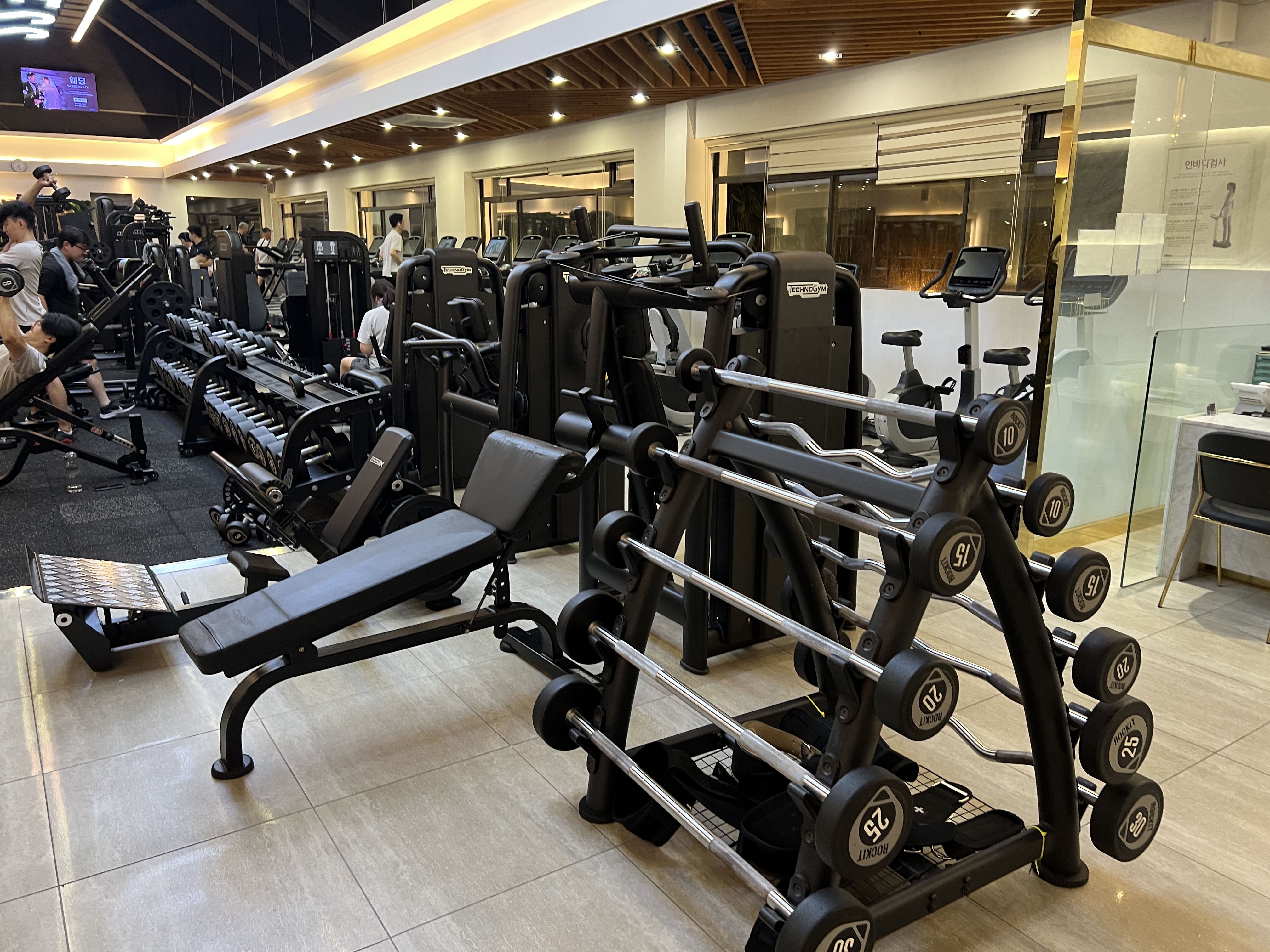 휴게소 같은 건물인데, 1층엔 G.X 하는 공간이 있었고 2층에 헬스장과 필라테스장이 같이 있는 형태였다. 외관상 건물이 제법 커 보여서 웨이트 공간도 넓을 줄 알았으나, 2층의반 정도만 웨이트 공간이었다.