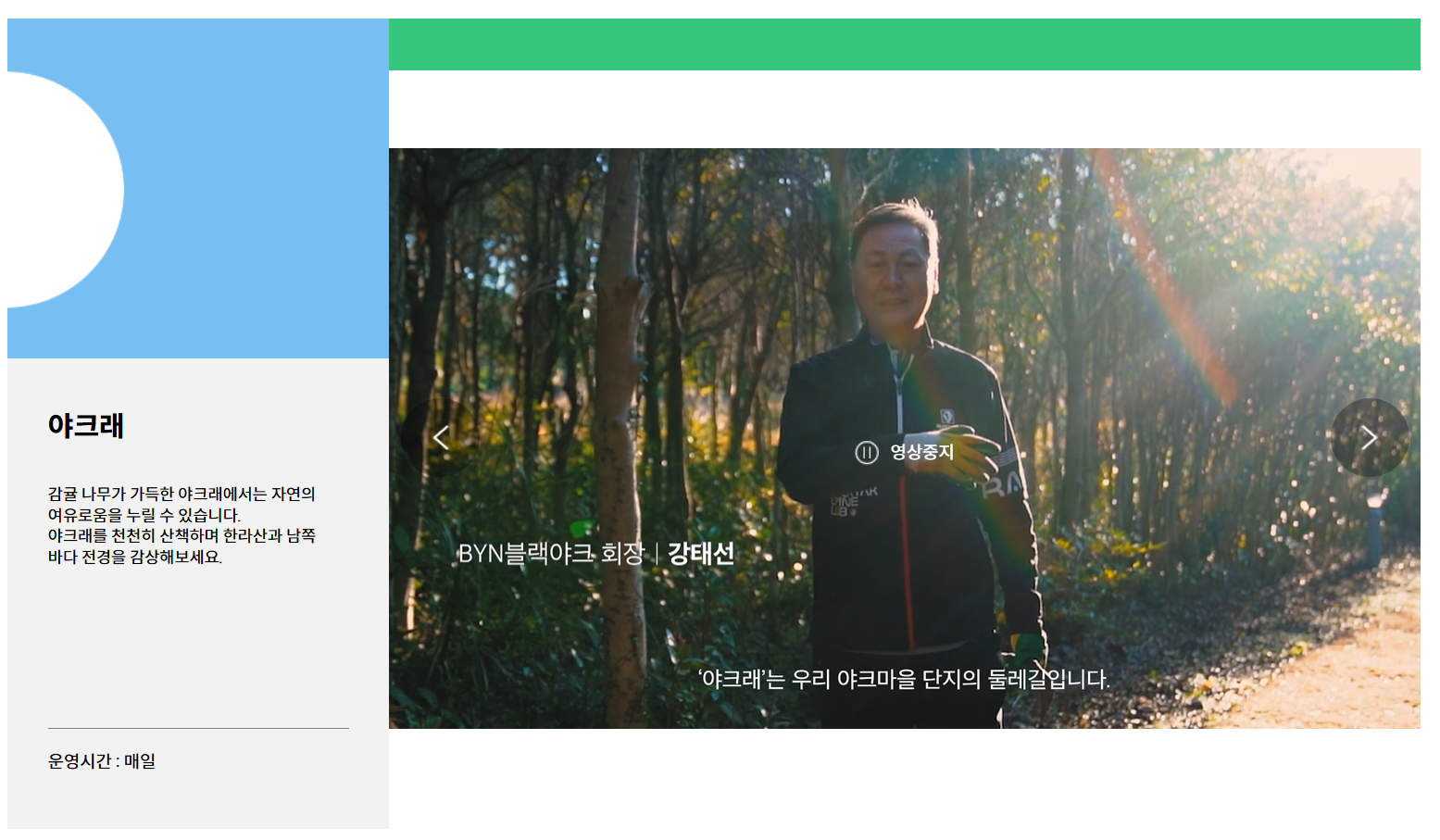 블랙야크 회장께서 야크래 소개 영상에 등장하여 설명을 하는데, 이 곳에 올 때마다 아침에 산책을 하신다고 한다.